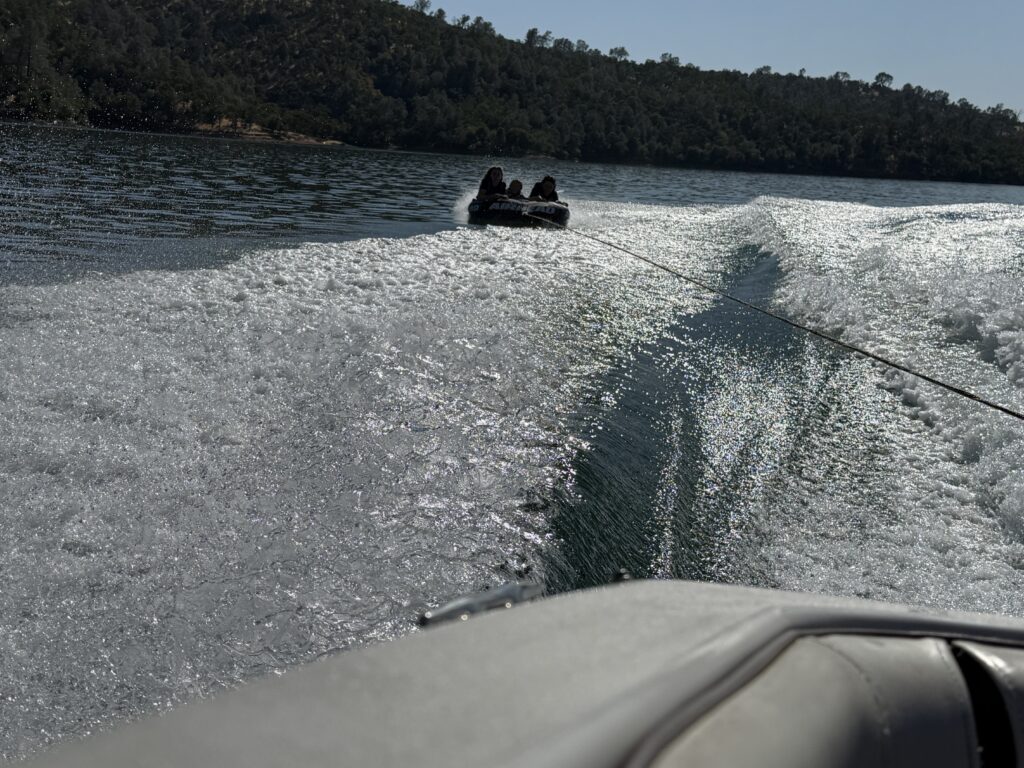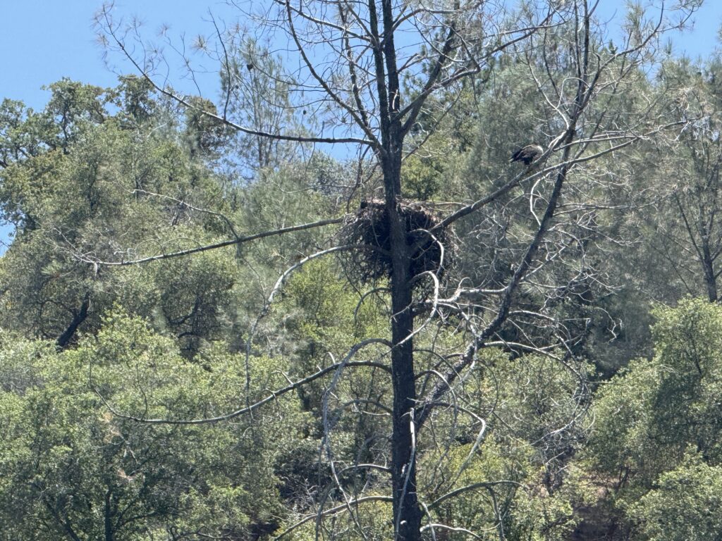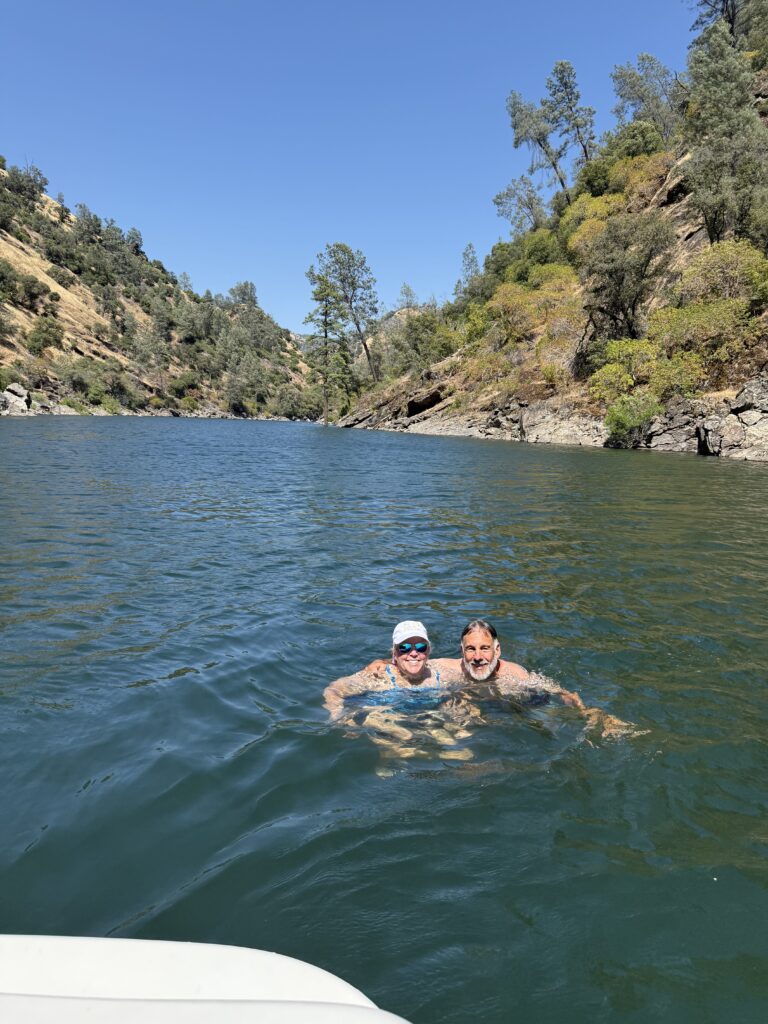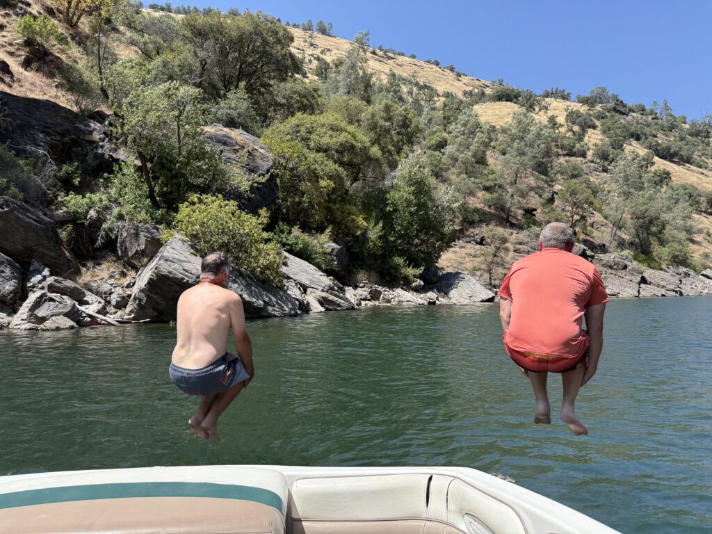 Saturday was much slower in getting started as we all were still tired from the long day and lots of sun we got the day before. The kids chose to spend time in camp playing games and hanging out in camp (mostly in the air-conditioned RV) so the adults went out on the boat to explore more of the lake. After refueling at Moccasin Point, we continued up the Tuolumne River canyon. The ride was beautiful. A highlight was spying two eagle nests and a total of five Bald Eagles in the trees on shore! When the water depth got too shallow, it was time to turn around. But not before enjoying a cooling dip in the water.