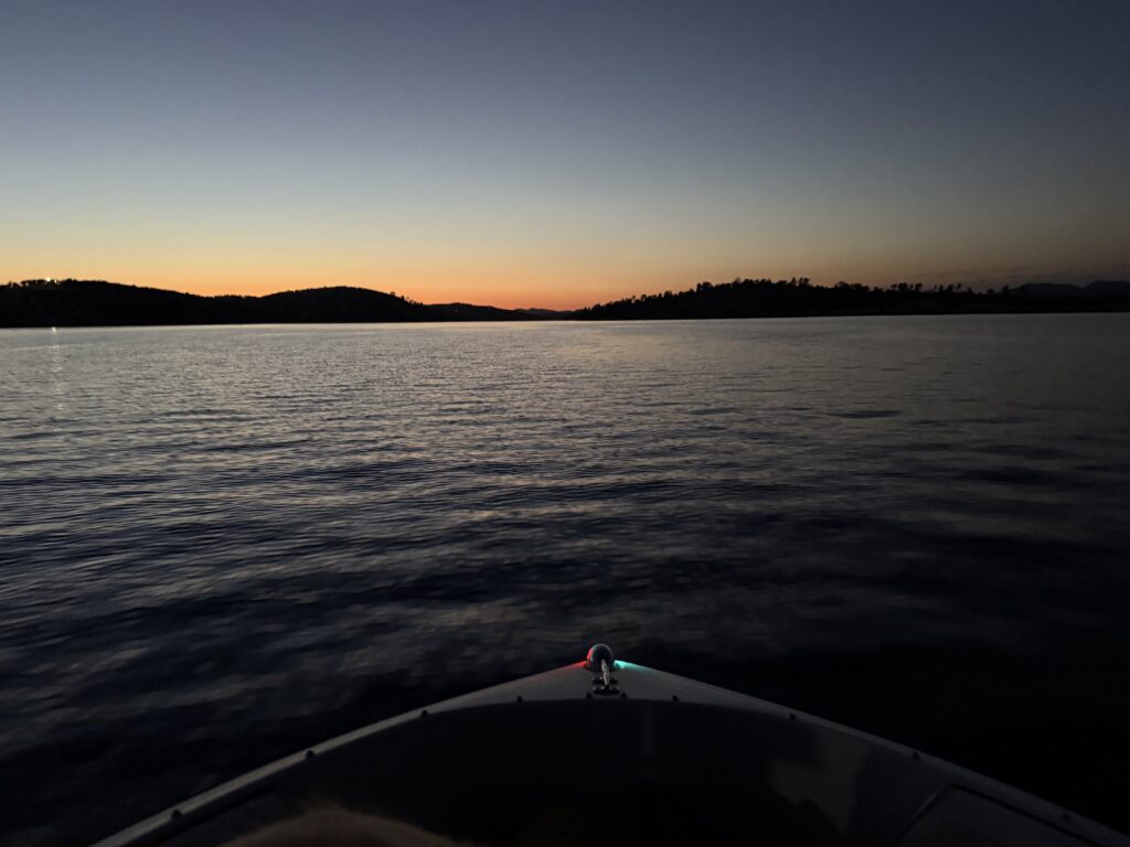 Upon returning to camp, we enjoyed snacks in the air-conditioned RV and a little down time. A late dinner of spaghetti and garlic bread was followed up with an evening cruise on the lake right after sunset; a great way to wind up the on-the-water part of the trip.