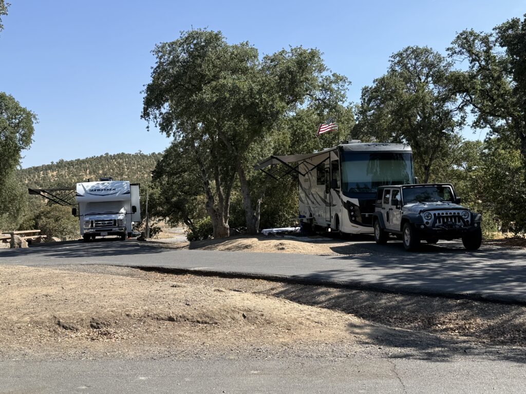 Last year a sequence of events cancelled two trips to go boating with friends, first at Rollins Reservoir and then at Lake Don Pedro. We finally were able to make the trip this year over the last four days. The trip was with Jason and Sarah Ann and their kids, who are frequent travel partners with us on our RV adventures. They have a boat, and we rented some jet skis to have delivered to the lake (more on that later). The drive up on Thursday was about 168 miles where Google Maps had us take numerous country roads across the Central Valley; lots of turns and stop signs but a scenic drive. After a fuel stop in Snelling, we arrived in camp in the early afternoon and made quick work of getting things set up.