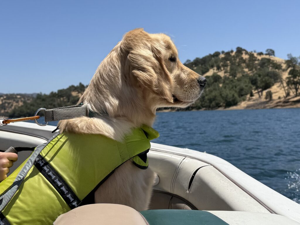 Rhone Working on her Sea Legs (Note... Safety First with the Doggie Personal Flotation Device)