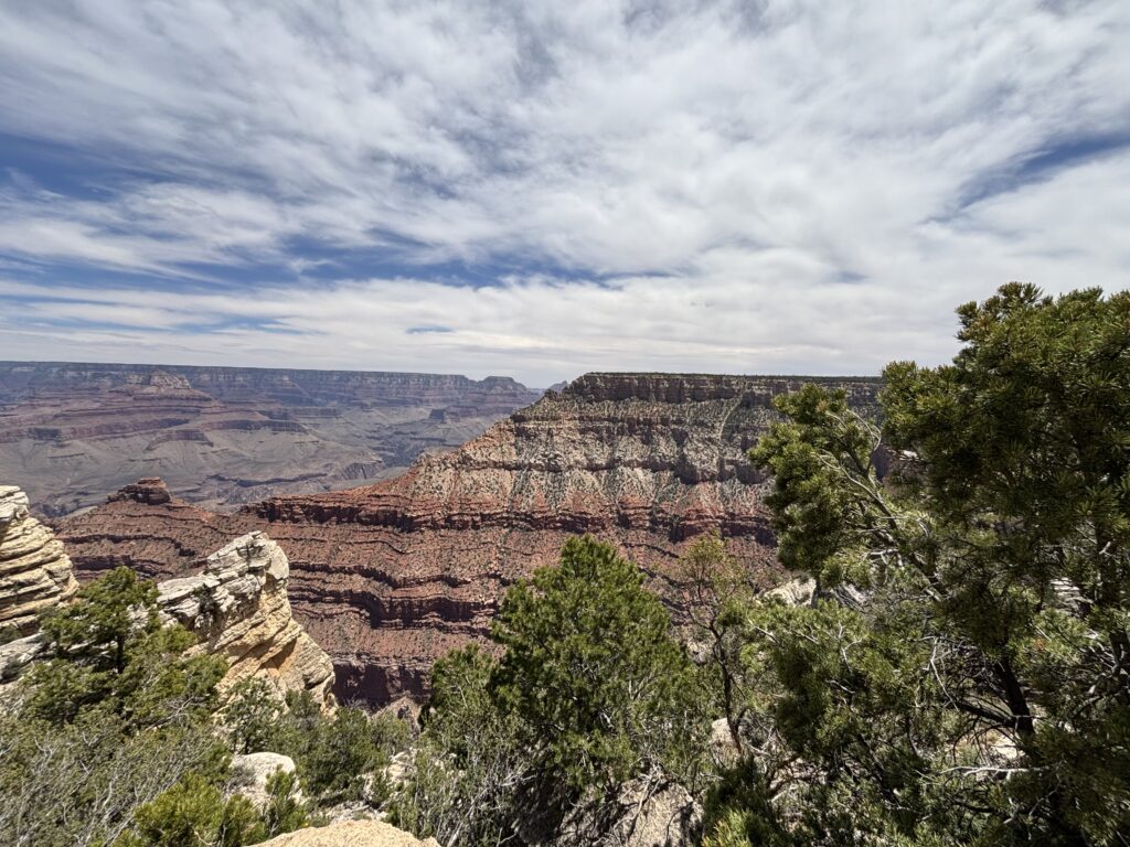 From the start of the path, it was only about a mile until we were in the park. The paved path was well maintained and kept us off the busy highway. It took us through a large, forested area that could have easily been in Tahoe, CA. We rode for a few miles and at the first junction, we headed for the South Kaibab Trailhead. Along the way, we rode along the rim of the canyon and stopped several times to take in the views and snap some photos. Until this point, the path was quiet and we saw very few bikers and walkers. Once we approached the trailhead, more and more people were out and about.