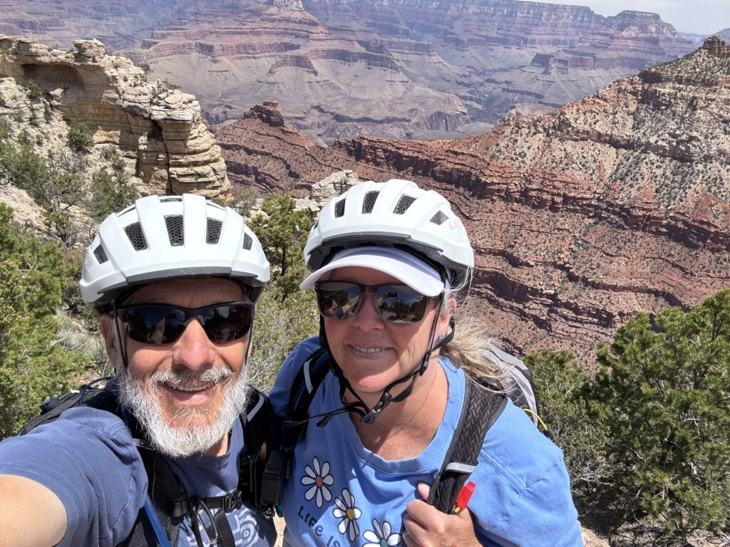 From the visitor center, we rode through the Grand Canyon Village (there is a train station there!) and stopped at the Bright Angel Trailhead. At this point, the path ends but bikes are allowed on the road with the shuttle buses. After some hesitation, Jen agreed to ride along the road. We rode to the next shuttle stop and took in the views. This was our turnaround point to ensure that we would have time to stop for a beer and still get the bikes back on time.